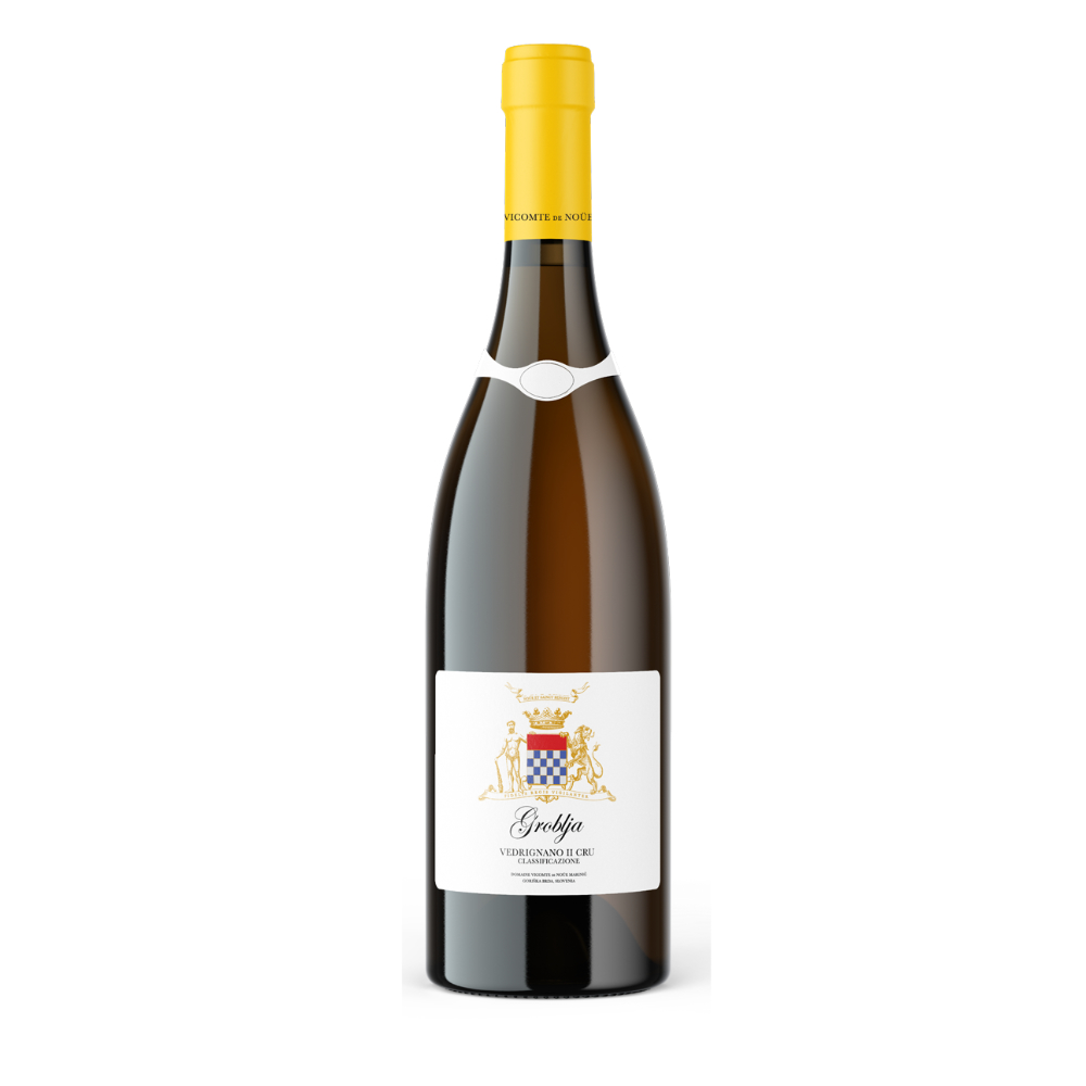 Groblja Vedrignano II Cru del Domaine Vicomte de Noüe‑Marinič è uno Chardonnay ricco e profondo nato dai suoli Ponca di Goriška Brda. Le uve, raccolte a mano, maturano a lungo in barrique francesi di secondo passaggio e poi in acciaio. Al naso compaiono glicine e caprifoglio, pesca matura, pompelmo e accenni di frutta tropicale, arricchiti da note di burro, fiocchi d’avena e brioche. In bocca il vino è pieno e strutturato ma sostenuto da acidità fresca e sapidità spiccata. La tessitura setosa e il finale molto lungo ricordano un grande bianco di Borgogna, pur mantenendo identità slovena. Perfetto con pesce pregiato, crostacei e pollame arrosto.