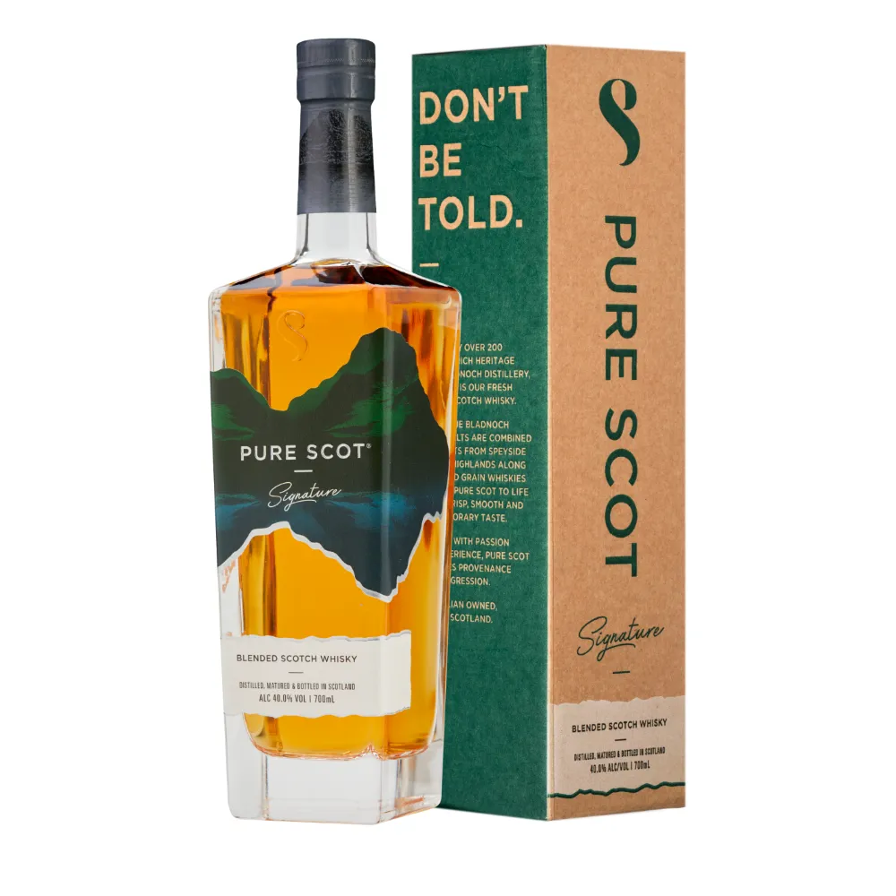 | Bladnoch Pure Scot Signature es un blended Scotch de corte moderno que combina el estilo elegante de la destilería con malts procedentes de varias regiones emblemáticas de Escocia. En nariz aparecen notas de toffee, caramelo y bizcocho de frutas, junto con matices de malta, cuero pulido y un suave toque ahumado. En boca el whisky resulta amplio y sedoso, con dulzor de miel, fruta madura y una especia ligeramente picante. La textura es cremosa y muy accesible, pero mantiene una buena profundidad aromática. El final se alarga con recuerdos de especias dulces, roble suave y una discreta nota de humo. Un whisky muy versátil, ideal para disfrutar solo, con hielo o como base de cócteles bien elaborados. | |