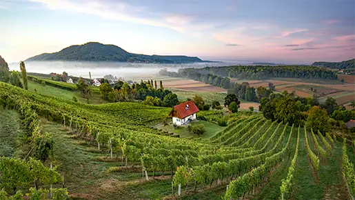 Tieschen, en el Vulkanland de Estiria, está rodeado de colinas volcánicas y muchas variedades distintas. Welschriesling, Traminer y Sauvignon Blanc muestran aromas intensos y mineralidad especiada. Los vinos son vivos, con carácter y a menudo de graduación moderada. Representan muy bien la Estiria moderna y centrada en el terruño.