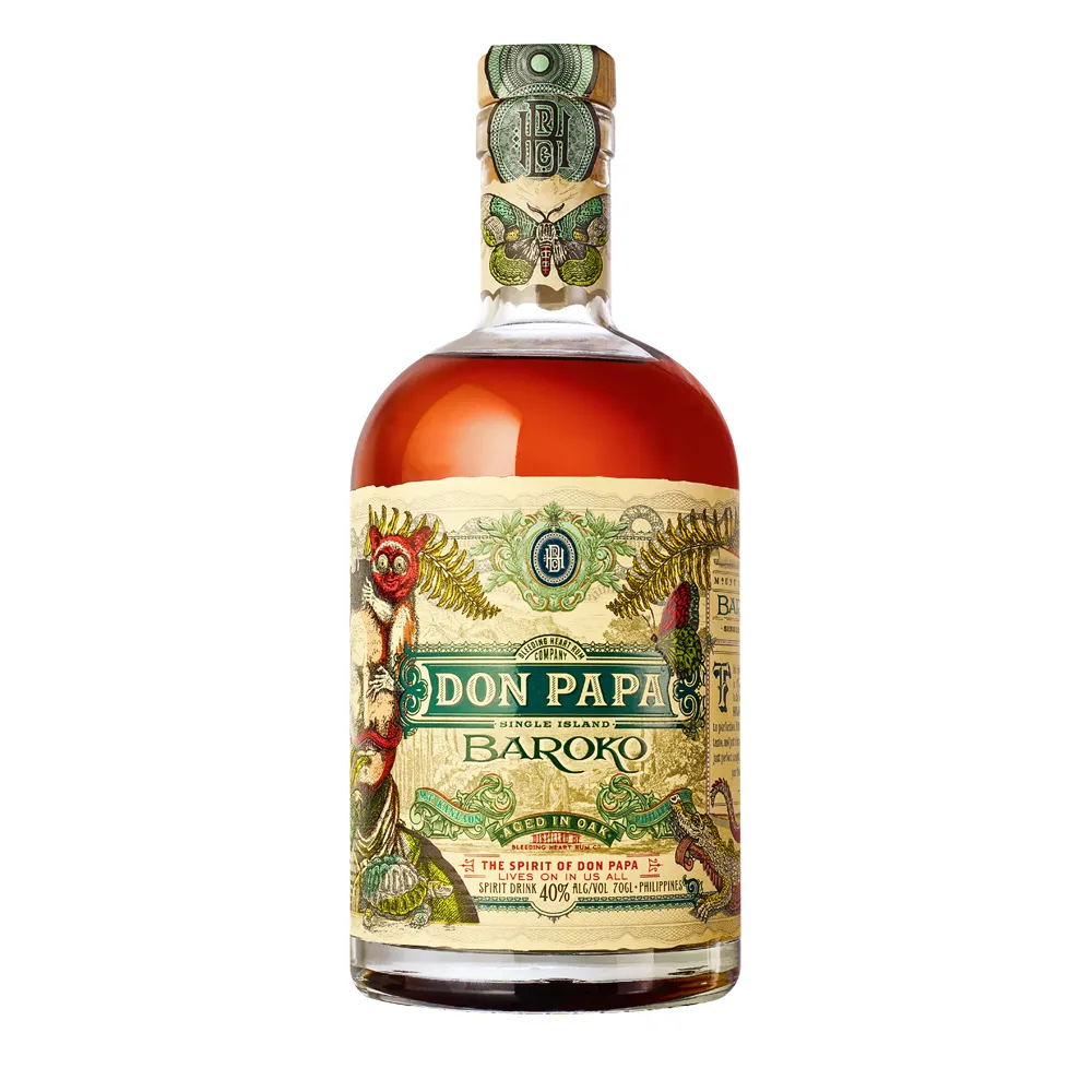 | Don Papa Baroko è una ricca spiritosa a base di rum ottenuta da melassa dell’isola di Negros e affinata in rovere americano. Al naso sprigiona vaniglia, frutta tropicale candita, miele e un tocco agrumato. In bocca è morbido e avvolgente, con note di vaniglia, caramello, frutta matura e delicate sfumature tostate del legno. La dolcezza generosa conduce a un finale caldo e persistente. Perfetto da sorseggiare con ghiaccio o come base sontuosa per cocktail cremosi e golosi in stile Don Papa. La struttura vellutata e il profilo dolce lo rendono particolarmente adatto a chi ama rum morbidi e avvolgenti. | |
