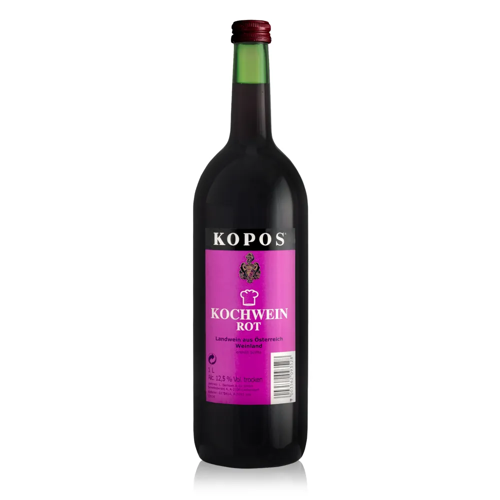 | KOPOS Rotwein es un vino tinto seco austriaco y forma parte de la gama de vinos de cocina KOPOS. Se elabora principalmente con Zweigelt y Rössler y ofrece un estilo frutal y equilibrado. En nariz aparecen cereza, frutos rojos y un ligero toque especiado. En boca el vino es de cuerpo medio, seco y redondo, con taninos suaves. Su estructura clara lo hace ideal para desglasar jugos de asado, para guisos, ragús y salsas oscuras. También funciona como sencillo vino de mesa para platos cotidianos contundentes. | |